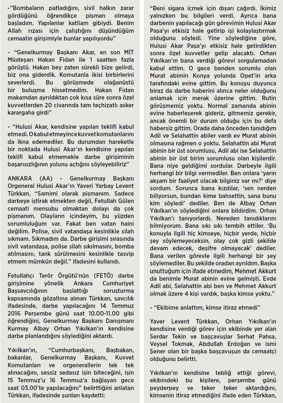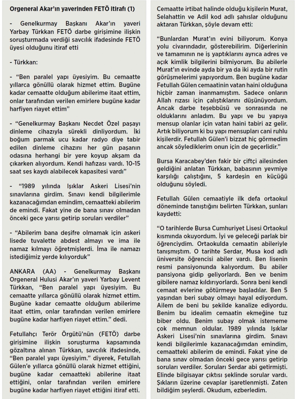16 Temmuz Cumartesi / 09:46 Eski Hava Kuvvetleri Komutanı Orgeneral Akın Öztürk ile Kara Kuvvetleri Eğitim ve Doktrin Komutanlığı (EDOK) Muhabere ve Destek Eğitim Komutanı Korgeneral Metin İyidil hakkında, vatana ihanet suçundan işlem başlatıldı.