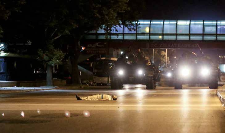 Ankara’da bir vatandaş kentin caddelerine giren zırhlı araçların önüne yatarak canı pahasına askeri kalkışmaya karşı koydu