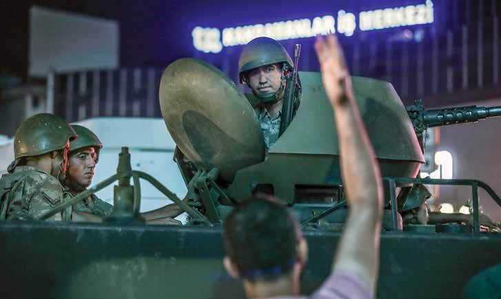 Ankara Kızılay Meydanı’nda askeri kalkışmayı protesto etmek için toplanan ve üzerlerine ateş açılan vatandaşlar zırhlı araçladaki silahlı askerleri protesto etti