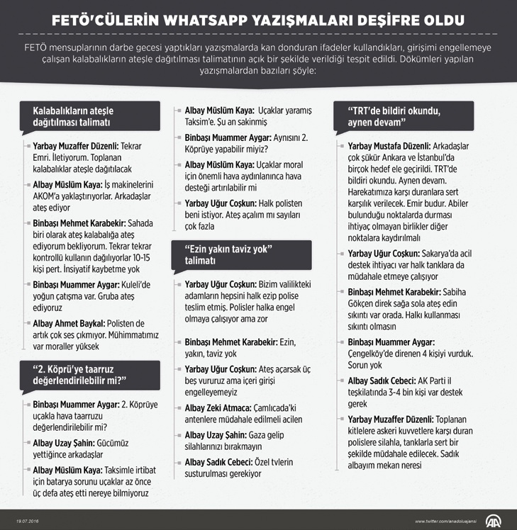 Fetullahçı Terör Örgütü’ne (FETÖ) mensup subayların, 15 Temmuz’da WhatsApp’ta oluşturdukları grup üzerinden darbe girişimini koordine ettikleri, yapılan yazışmalarda sivil vatandaşlara yönelik vur emrini “Ezin, yakın, taviz yok” gibi ifadelerle verdikleri ve girişimleri bastırılınca da kaçma planları yaptıkları ortaya çıktı.