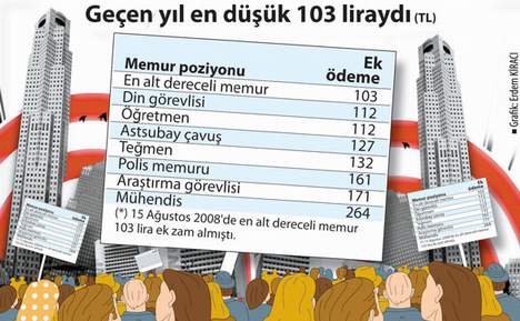Bugün'ün haberine göre hükümet, kamuda aynı işi yapan memurların aynı ücret almasını sağlayarak ücret adaletsizliğini giderebilmek için geçen yıl ağustos ayında bir Bakanlar Kurulu Kararı yayınlamış ve bu yolla tazminat ve görev aylığı gibi yan ödemesi olmayan memurlara ek ödeme yapmıştı. Böylece polisler, mühendisler, öğretmenler ve askerler gibi kamudaki yaklaşık 1 milyon 400 bin memur ek ödemeye kavuşmuştu.