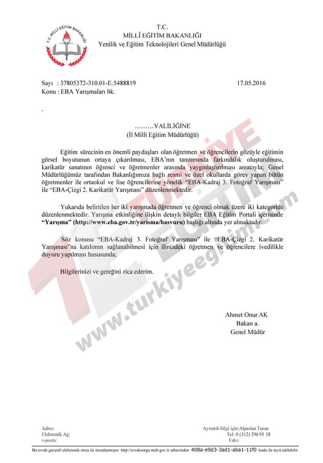 Söz konusu “EBA-Kadraj 3. Fotoğraf Yarışması” ile “EBA-Çizgi 2. Karikatür Yarışması”na katılımın sağlanabilmesi için ilinizdeki öğretmen ve öğrencilere ivedilikle duyuru yapılması hususunda;