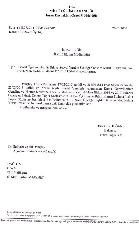 MEB İnsan Kaynakları Genel Müdürlüğü, tüm illere Bekir Erdoğan imzasıyla 26 Ocak 2016 tarihli ve 68898891-(19)/900/940905 sayılı yazıyla, yürütmenin durdurulması kararını gerekçe göstererek, İLKSAN üyeliğinin zorunlu olduğunu bildirmiştir.
