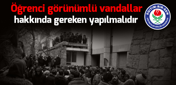 Eğitim-Bir-Sen olarak, öğrenci görünümlü vandallar hakkında gerekenin yapılması için YÖK Başkanlığı’na ve hukuki yollara başvuracağımızı ifade ediyor; bir kez daha her türlü şiddeti kınıyor, ilgilileri bilimin ve barışın gerektirdiği sorumluluklarının gereğini yapmaya, gençlerimizi sağduyuya, saygıya davet ediyoruz.