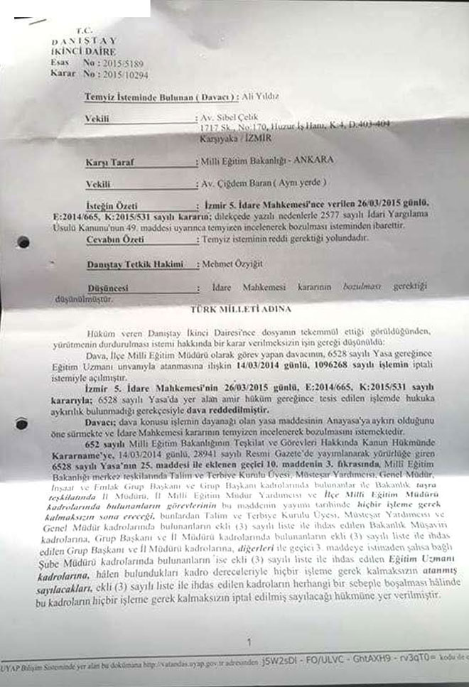 Sendikamız üyesi Ali YILDIZ’ın İlçe Milli Eğitim Müdürü olarak görev yaptığı dönemde 6528 sayılı Yasa gereğince Eğitim Uzmanı unvanıyla atanmasına ilişkin başvurusunun reddedilmesi üzerine bu idari işlemin iptali istemiyle açtığı davada üyemizin talebi İzmir 5. İdare Mahkemesi tarafından reddedilmiştir. Dava konusu işlemin dayanağı olan yasa maddesinin Anayasa’ya aykırı olduğu ileri sürülerek İdare Mahkemesinin kararı temyiz edilmiştir.