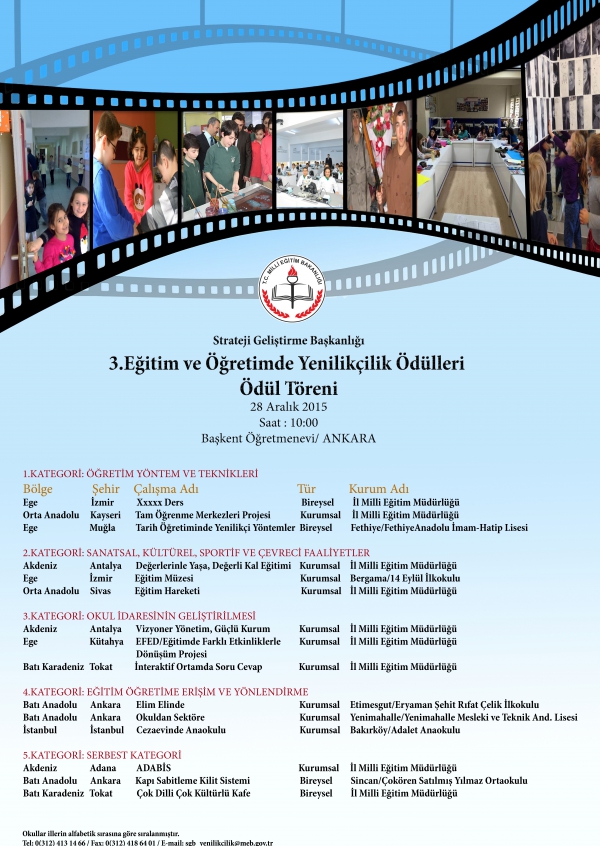"Eğitim ve Öğretimde Yenilikçilik Ödülleri" Bakanlık Ödül Töreni 28 Aralık 2015 tarihinde Başkent Öğretmenevi'nde gerçekleştirilecek.
