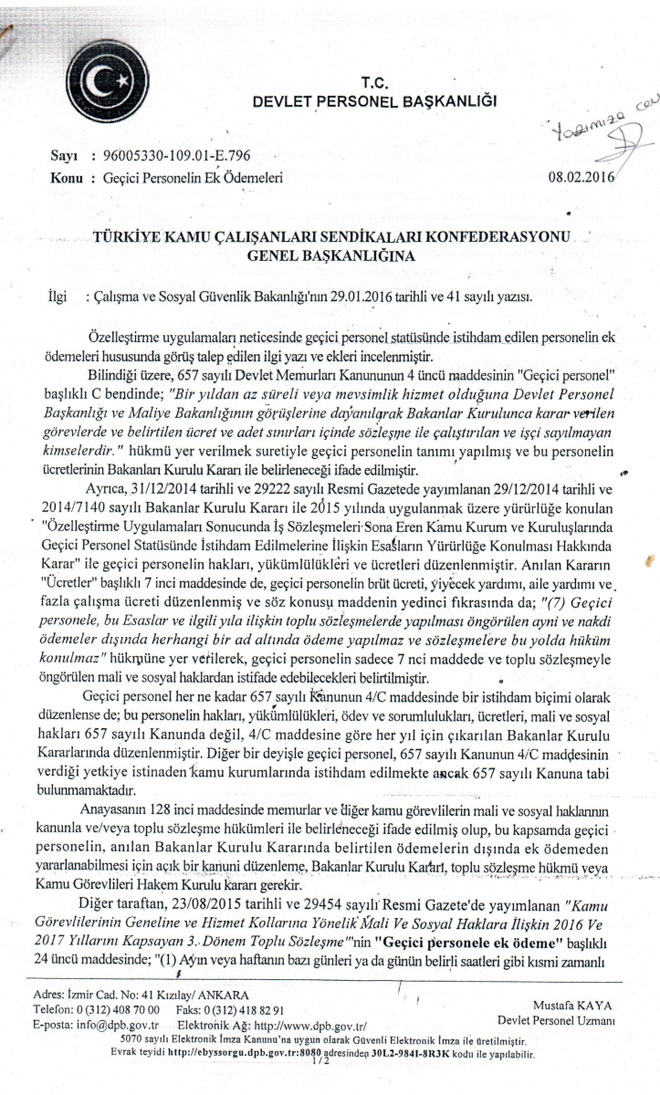 2015 yılı toplu sözleşme görüşmelerinde 657 sayılı Kanunun 4. maddesinin “C” fıkrası uyarınca çalıştırılan geçici personele 01.01.2016 tarihinden itibaren 1800 gösterge rakamının memur maaş katsayısı ile çarpımı sonucu bulunacak tutar (159,87 TL) kadar ek ödeme verilmesi karara bağlanmıştı.
