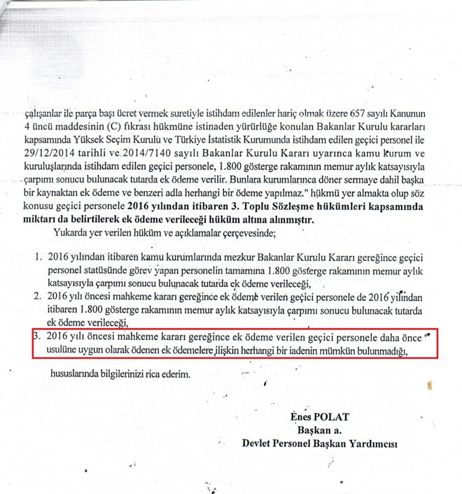 Toplu sözleşme hükümlerinin 1 Ocak 2016 itibarı ile yürürlüğe girmesiyle birlikte, haklarında olumlu mahkeme kararı dahi olsa, söz konusu personele mahkemenin öngördüğü miktar yerine toplu sözleşme ile belirlenen miktarda ek ödeme verilmesi öngörüldü.