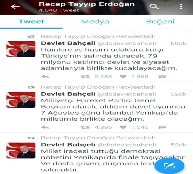 MHP lideri Bahçeli, Twitter hesabından "Millet iradesi tuttuğu demokrasi nöbetini Yenikapı'da finale taşıyacaktır. Ve dosta güven, düşmana korku salacaktır. MHP Genel Başkanı olarak, aldığım davet uyarınca 7 Ağustos günü İstanbul Yenikapı'da milletimle birlikte olacağım. Hainlere ve hasım odaklara karşı Türkiye'nin safında duracak, 79 milyonu katılımcı devlet ve siyaset adamlarıyla birlikte kucaklayacağım" ifadelerinin yer aldığı tweeti paylaştı. Devlet Bahçel'nin paylaştığı tweetleri Cumhurbaşkanı Recep Tayyip Erdoğan'ın olduğu bilinen @DT_Erdogan kullanıcı isimli hesap da retweetledi.