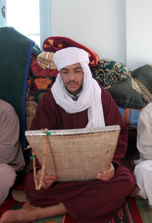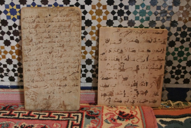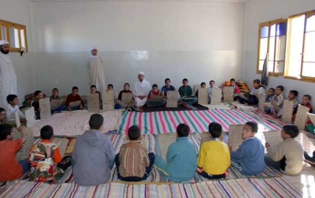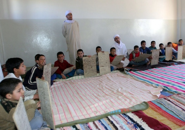 Ezbere dayalı eğitim sisteminde öğrenciler, derslerini kağıt yerine tahta levhalar üzerine yazıyor ve sıra yerine yere oturuyor.