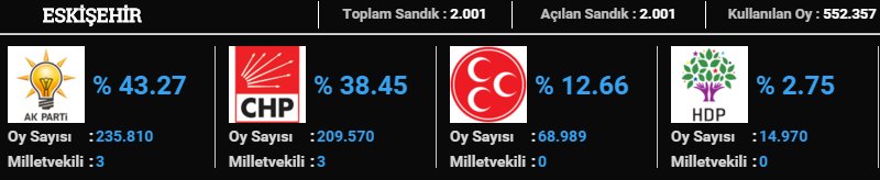 İzmir gibi yıllarca CHP'nin birinci parti olarak çıktığı Eskişehir'de, Milli Eğitim Bakanı Nabi Avcı'yı birinci sıra adayı yapan AK Parti oylarını 8 puan birden artırarak yüzde 43 aldı. CHP ise yüzde 38'le ikinci parti oldu. AK Parti ve CHP Eskişehir'den çıkan 6 vekili 3-3 bölüştü. Eskişehir, CHP'nin İç Anadolu Bölgesi'ndeki tek kalesiydi..