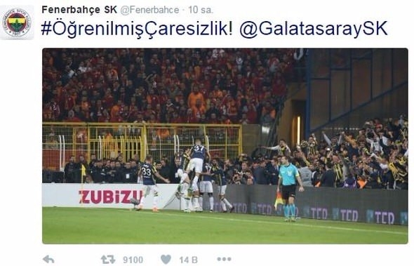 Fenerbahçe Kulübü'nün resmi Twitter hesabından Galatasaray maçı sonrası sosyal medyada büyük yankı yaratan paylaşımlar yapıldı. İlk olarak Fenerbahçeli futbolcuların bir sevinç fotoğrafın üzerine yazılan mesajda, 'Öğrenilmiş Çaresizlik' hashtag'i ile Galatasaray Kulübü'ne gönderme yapıldı.