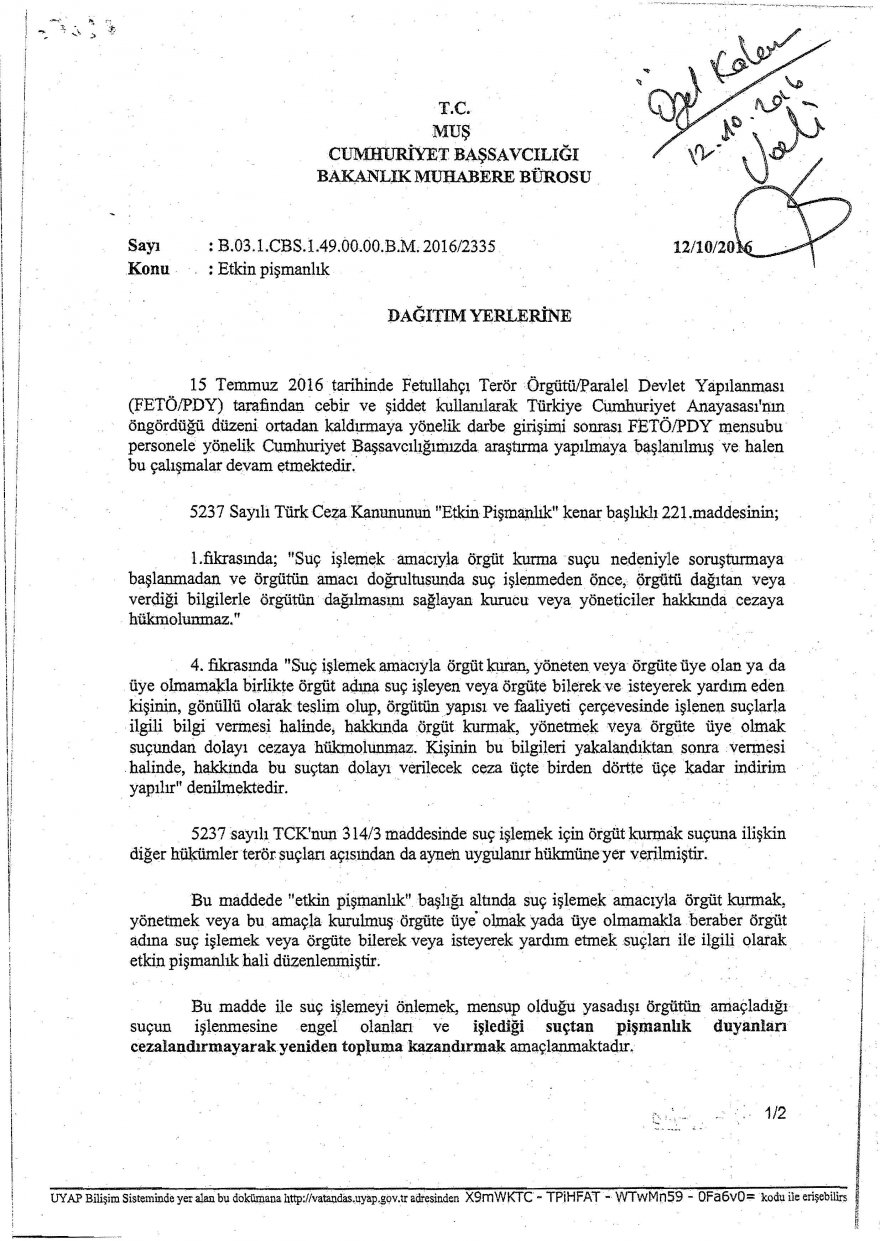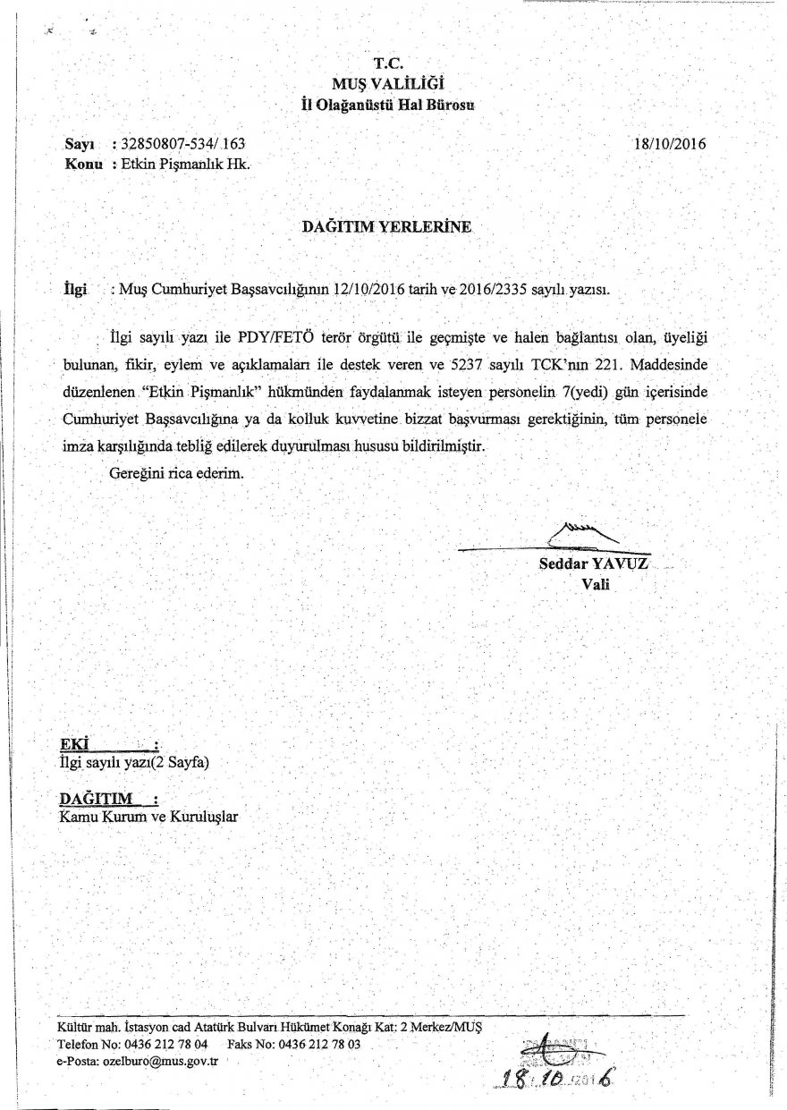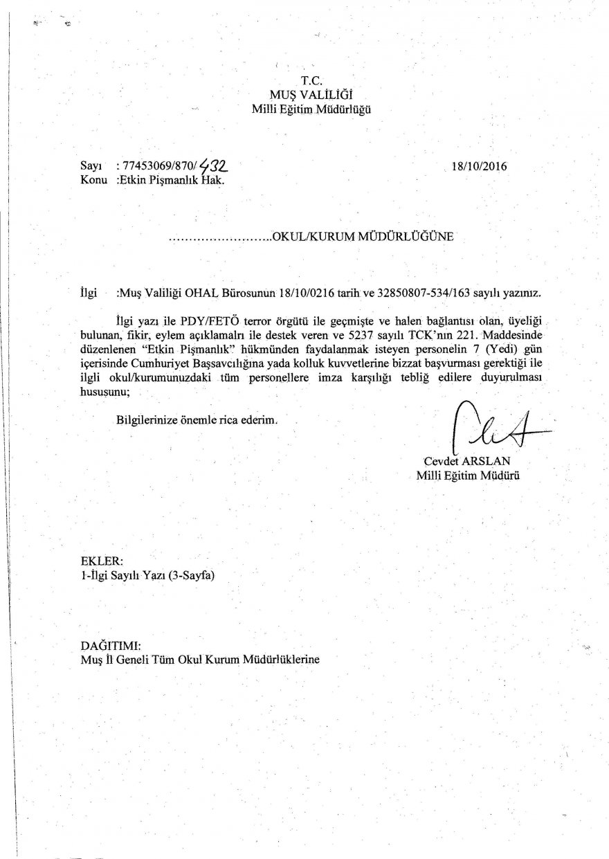Milli Eğitim Müdürlüğünden Etkin Pişmanlık Duyurusu. Muş İl Milli Eğitim Müdürlüğünden ''Etkin Pişmanlık'' Yazısında bu hükümden faydalanmak isteyenlerin yedi gün içerisinde yetkililere başvurabileceği ifade edildi.