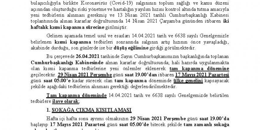 İçişleri Bakanlığı Tam Kapanma Tedbirleri Genelgesi