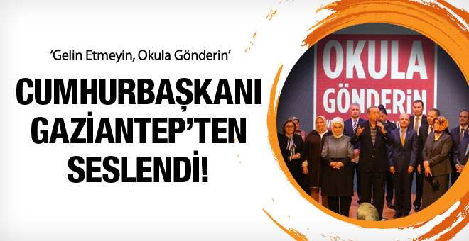 Gaziantep Büyükşehir Belediyesi tarafından organize edilen 'Gelin Etmeyin, Okula Gönderin' projesi tanıtım toplantısına Cumhurbaşkanı Erdoğan başta olmak üzere birçok siyasi isim katıldı.