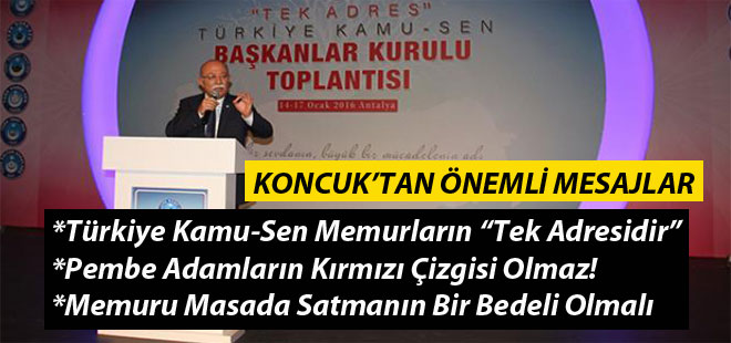 Koncuk, "Ülkemiz güzel günler geçirmiyor, aklı başında olan insanların tüylerini diken diken etmesi gereken bir zaman dilimi yaşıyoruz. Kendilerini aydın diye tanımlayanlar bile sadece günü kurtarmak gayreti içindeler. "Bu çatı çökerse altında hepimiz kalırız" dedik. Görüyoruz ki, bu sütunlar çatırdarken buna omuz verenlerin sayısı da bir avuç. Onlarda Türkiye Kamu-Sen içinde örgütlenmiş insanlardır.