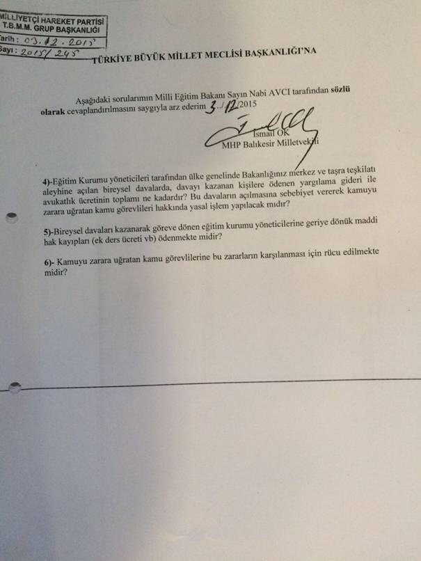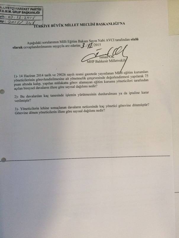 MHP Balıkesir Milletvekili İsmail Ok, Danıştay kararına rağmen görevlerine iade edilmeyen okul müdürleri için Milli Eğitim Bakanı Nabi Avcı ve Maliye Bakanı Naci AĞBAL'ın cevaplamaları talebiyle sözlü soru önergeleri verdi.