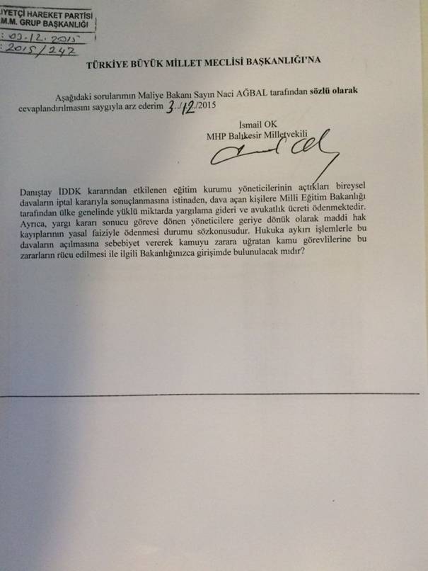 Maliye Bakanı Naci AĞBAL'a ise yöneltilen sözlü soru önergesinde; "Danıştay İDDK kararından etkilenen eğitim kurumu yöneticilerinin açtıkları bireysel davaların iptal kararıyla sonuçlanmasına istinaden, dava açan kişilere Milli Eğitim Bakanlığı tarafından ülke genelinde yüklü miktarda yargılama gideri ve avukatlık ücreti ödenmektedir. Ayrıca yargı kararı sonucu göreve dönen yöneticilere, geriye dönük olarak maddi hak kayıplarının yasal faiziyle ödenmesi durumu söz konusudur. Hukuka aykırı işlemlerle bu davaların açılmasına sebebiyet vererek kamuyu zarara uğratan kamu görevlilerine bu zararların rücu edilmesi ile ilgili bakanlığınızca girişimde bulunulacak mıdır?" konusundaki çalışmalar soruldu.