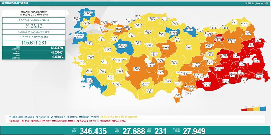 Türkiye'de son 24 saatte 346 bin 435 Kovid-19 testi yapıldı, 27 bin 688 kişinin testi pozitif çıktı, 231 kişi yaşamını yitirdi.