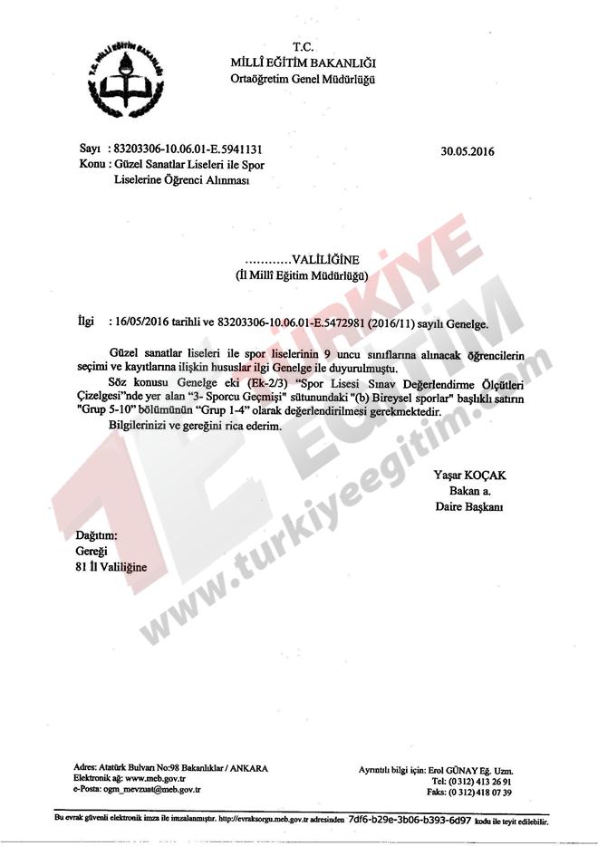 Güzel sanatlar liseleri ile spor liselerinin 9 uncu sınıflarına alınacak öğrencilerin seçimi ve kayıtlarına ilişkin hususlar İlgi Genelge ile duyurulmuştu.