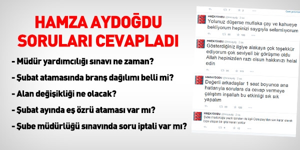 Milli Eğitim Bakanlığı İnsan Kaynakları Genel Müdürü Hamza Aydoğdu, sosyal medya hesabı üzerinden, eğitim çalışanlarının sorularını cevapladı.
