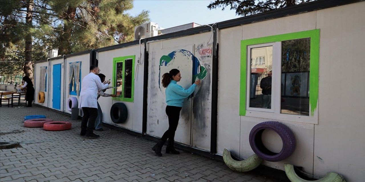 Hatay'da depremzede liseliler, konteyner sınıfları resim ve süslerle renklendirdi