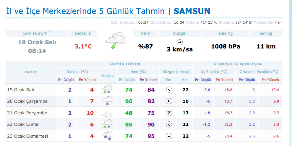 SAMSUN için meteoroloji hava durumu tahmininde çarşamba gününe kar yağışı verdi. Samsun yeni yıla kar altında girecek. Yılbaşı gecesi ile birlikte 2016 yılının ilk günleri de Samsun'da kar yağışlı olacak. Samsun için yayınlanan 5 günlük hava durumu tahmini şöyle;