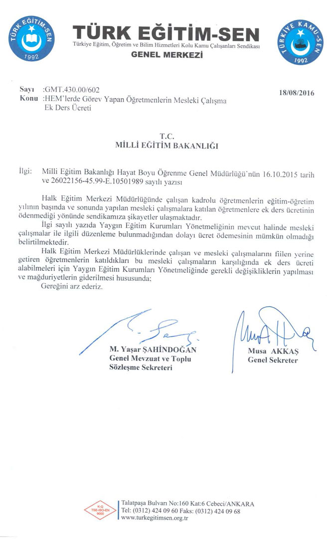 Halk Eğitim Merkezi Müdürlüğünde çalışan kadrolu öğretmenlerin eğitim-öğretim yılının başında ve sonunda yapılan mesleki çalışmalara katılan öğretmenlere ek ders ücretinin ödenmediği yönünde sendikamıza gelen şikayetler doğrultusunda, Türk Eğitim-Sen olarak; Halk Eğitim Merkezi Müdürlüklerinde çalışan ve mesleki çalışmalarını fiilen yerine getiren öğretmenlerin katıldıkları bu mesleki çalışmaların karşılığında ek ders ücreti alabilmeleri için Milli Eğitim Bakanlığına yazılı başvuruda bulunduk.