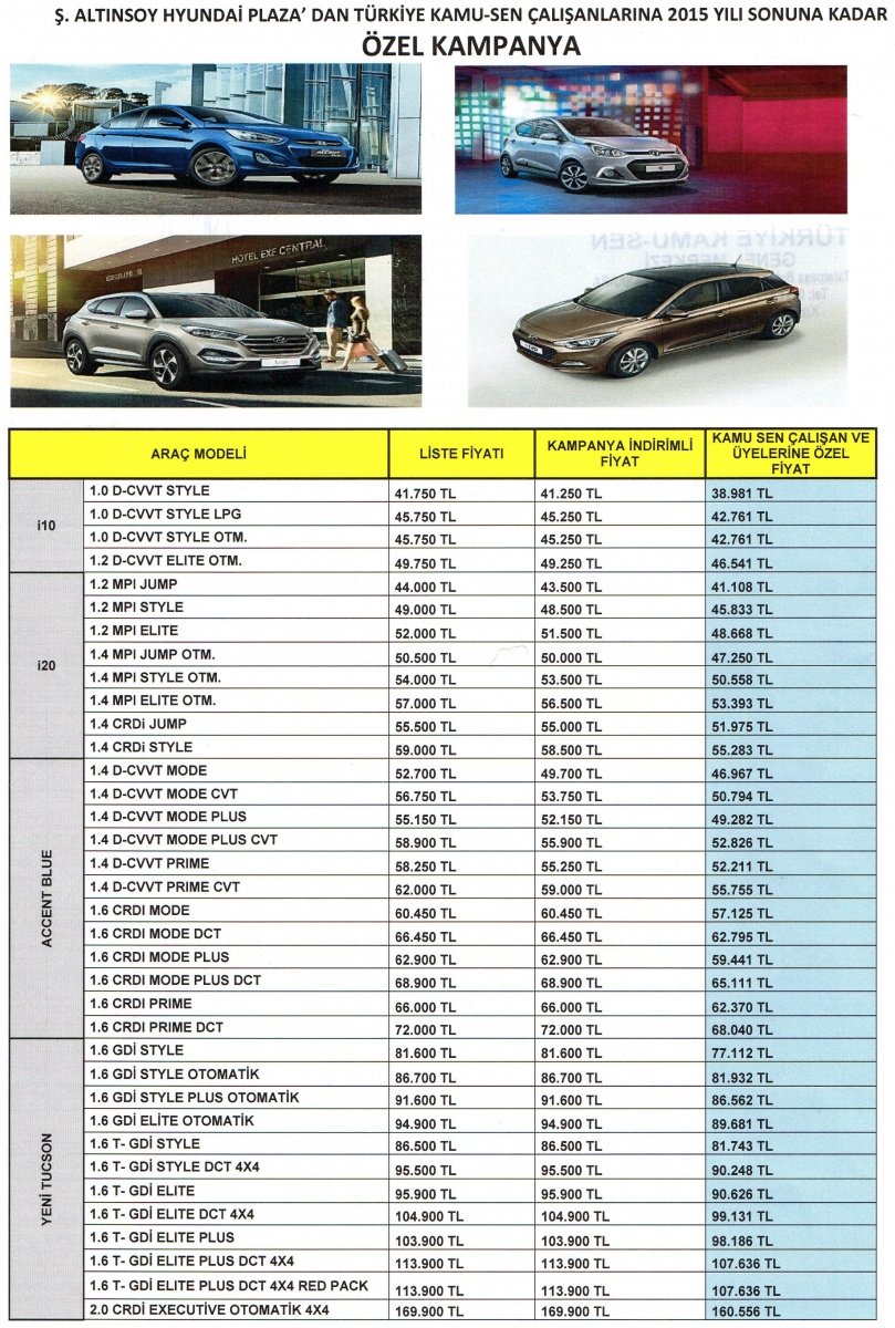 2015 yılı sonuna kadar sürecek olan kampanya çerçevesinde, yalnızca Türkiye Kamu-Sen üyelerine özel olarak Şinasi Altınsoy Hyundai Plazadan yapılacak olan satışlarda yüzde 5,5 oranında özel indirim sağlanacaktır.