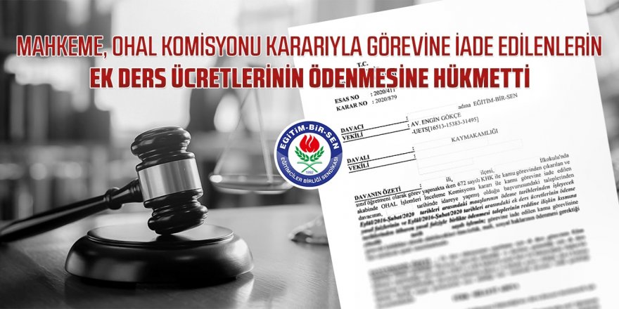 Eğitim-Bir-Sen olarak, Kanun Hükmünde Kararname ile kamu görevinden çıkarılan ve sonrasında OHAL Komisyonu kararıyla görevine iade edilen üyemizin ek ders ücretlerinin ödenmesi talebinin reddine ilişkin işlemin iptali için açtığımız davada, mahkeme, dava konusu işlem olmasaydı, fiilen çalışma şartını yerine getireceğinden, üyemizin görevde olmadığı döneme ilişkin tüm ek ders ücretlerinin yasal faiziyle birlikte ödenmesi gerektiğine karar verdi.