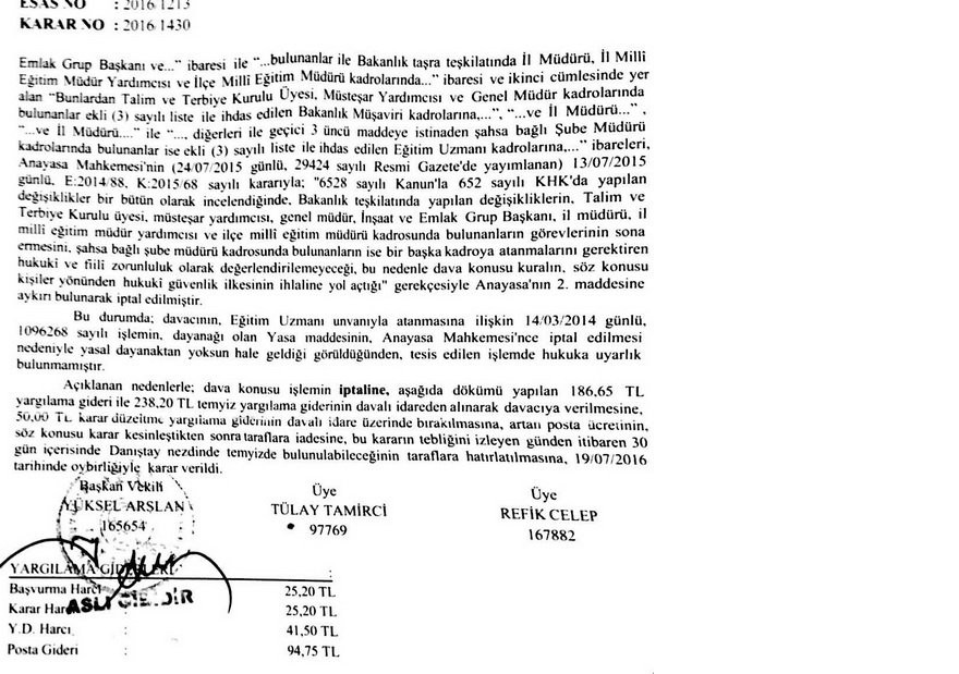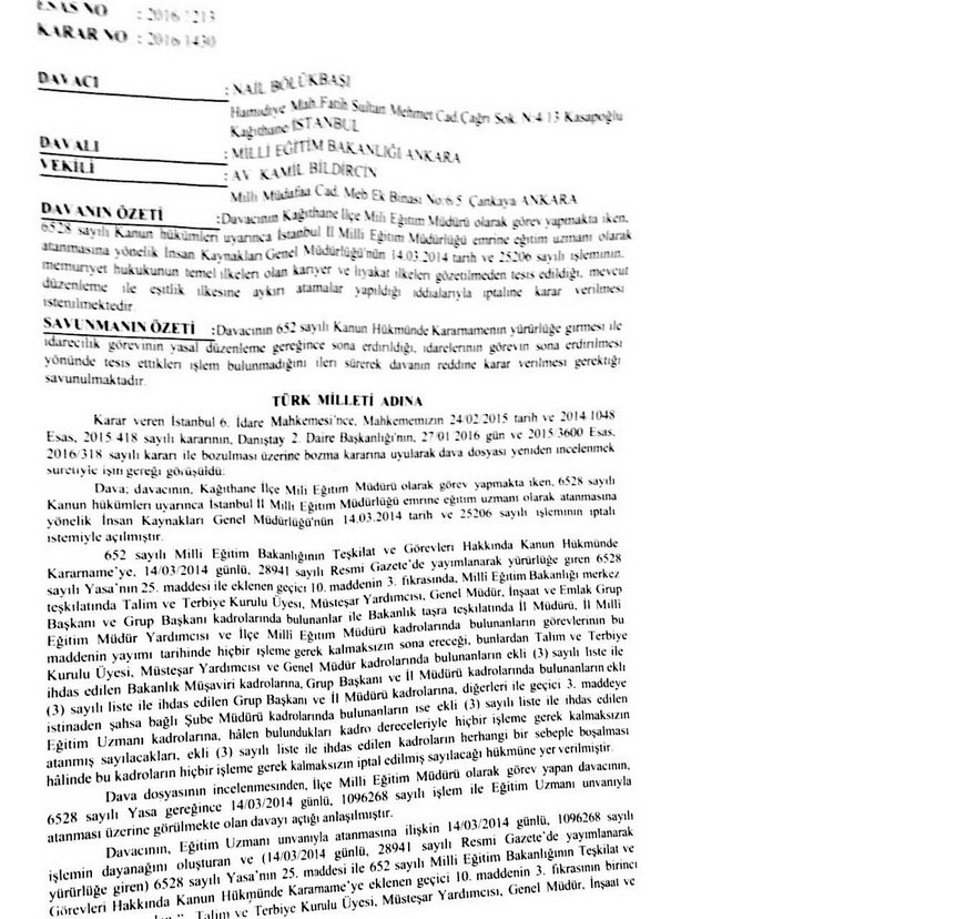 İstanbul Kağıthane İlçe Milli Eğitim Müdürü Nail BÖLÜKBAŞI'nında bu yargı sürecine dahil olmasıyla İstanbul 6. İdare Mahkemesin aşağıda yer verdiğimiz kararı ile görevine iade edilmiştir.