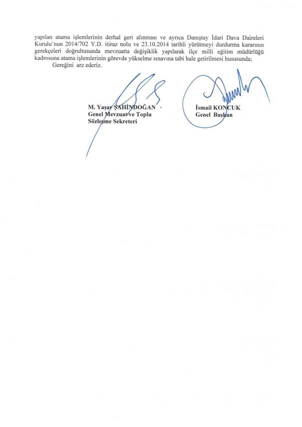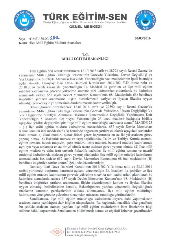Türk Eğitim Sen olarak Bakanlığa gönderdiğimiz yazıda, Sendikamıza, ilçe milli eğitim müdürlüğü kadrolarına duyuru dahi yapılmaksızın asaleten atama yapıldığına dair bilgiler ulaştığını belirterek, öncelikle ülke genelinde bu şekilde asaleten ataması yapılan ilçe milli eğitim müdürlerinin isim listelerinin bildirilmesini; ayrıca somut ve objektif kriterler gözetilmeden yapılan atama işlemlerinin derhal geri alınmasını, Danıştay İdari Dava Daireleri Kurulu’nun 2014/702 Y.D. itiraz nolu ve 23.10.2014 tarihli yürütmeyi durdurma kararının gerekçeleri doğrultusunda mevzuatta değişiklik yapılarak ilçe milli eğitim müdürlüğü kadrosuna atama işlemlerinin görevde yükselme sınavına tabi hale getirilmesini talep ettik.