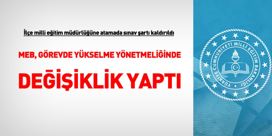 MEB, Görevde Yükselme, Unvan Değişikliği ve Yer Değiştirme Suretiyle Atanması Hakkında Yönetmelikte değişiklik yapıldı. İlçe milli eğitim müdürü kadrosuna yapılacak atamalarda aranan sınav şartı kaldırıldı