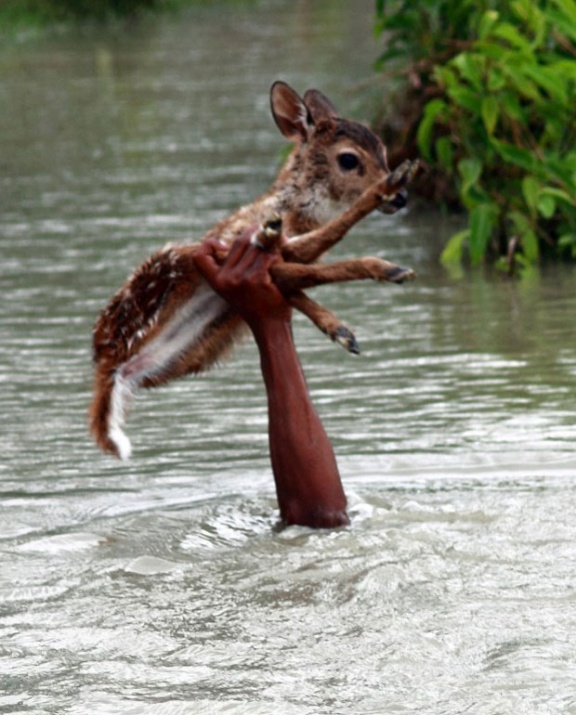 Çocuk sağ salim kıyıya çıkarken, hayatını riske ederek tümüyle sular içindeyken geyik yavrusunu elinin üzerinde taşıdığı fotoğraf, insanlık adına bir abide olarak zihinlerde yer etti.