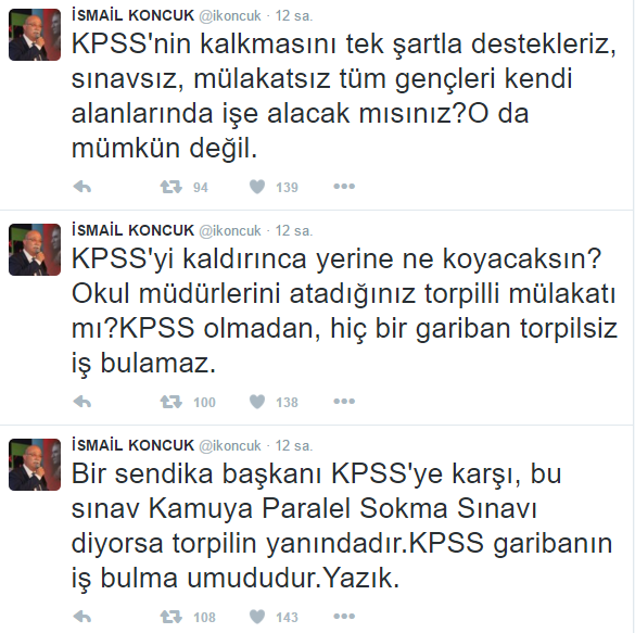 Bir sendika başkanı KPSS'ye karşı, bu sınav Kamuya Paralel Sokma Sınavı diyorsa torpilin yanındadır.KPSS garibanın iş bulma umududur.Yazık.
