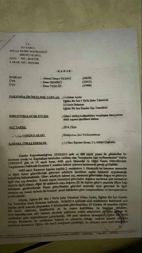 Türk Eğitim Sen İstanbul Şubeleri olarak YANDAŞ-YALAKA-SARI Sendika yöneticilerinin yönetici görevlendirme yönetmeliği gereğince yapılacak mülakat öncesi kimlerin başarısız sayılması gerektiği, kimlere yüksek puan verileceği ve hangi şube temsilcilerine 100 tam puan verilmesi gerektiği ile ilgili aralarında yaptıkları mail trafiğini tespit etmiş, Ip adresleriyle birlikte cumhuriyet savcılığına suç duyurusunda bulunmuştuk. Ancak kaymakamlıklar soruşturma izni vermemiş bizde buna istinaden bölge idare mahkemesine başvuru yapmıştık.