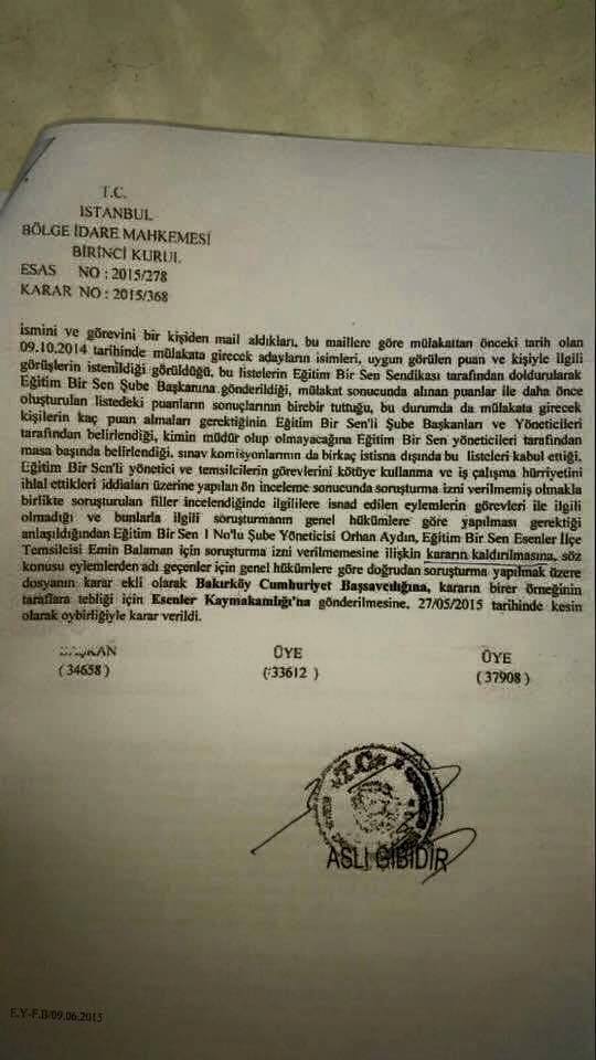 2014 yılında müdürlük mülakatları ile ilgili TÜrk Eğitim Sen istanbul Şubelerinini gündeme getridği ve yargıya taşıdığı Bakırköy ilçesinden mülakata girecek kişilerin EK 2 puanı ile mülakatta kaç puan almaları gerektiği yazılı bir liste elektronik posta yazışmaları ile ilgili mahkeme sürecinde flaş karar çıktı.