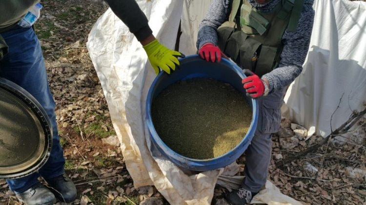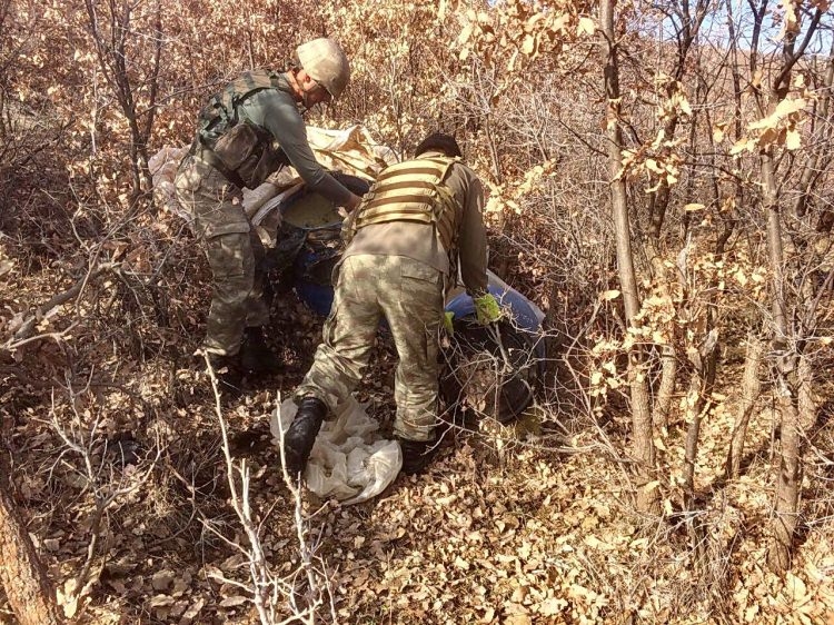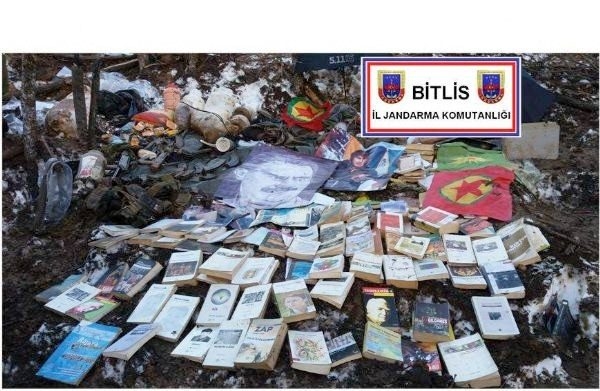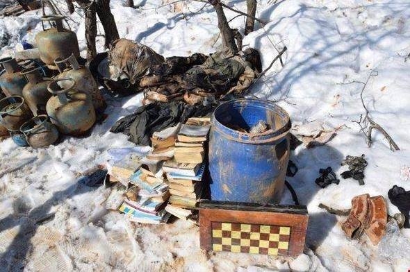 15 kg kuru fasulye, 15 kg çay, 11 sırt çantası, 10 not defteri, 10 kg kırmızı mercimek, 10 kg tuz, 7 büyük tüp, 7 küçük tüp, 6 kutu konserve balık, 6 yemek tabağı, 5 kütüklük, 4 şemsiye, 4 testere, 3 çaydanlık, 2 kg karışık çerez, 2 düdüklü tencere, 2 balta, 1 tüplü fırın, 1 ocak (3’lü), 1 ses kayıt cihazı, 1 kazma, 1 kürek, 1 tencere, 1 tavla ve muhtelif miktarda naylon ele geçirilmiştir.