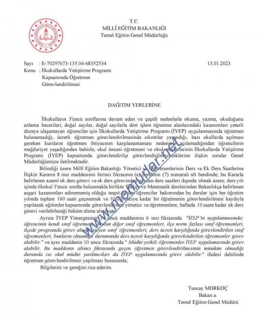 Milli Eğitim Bakanlığı Temel Eğitim Genel Müdürlüğü 13.01.2023 tarih ve 68352534 sayılı yazılarıyla İlkokullarda Yetiştirme Programı Kapsamında (İYEP) hangi öğretmenlerin görevlendirileceğini açıkladı.