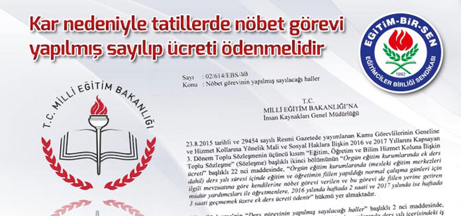 Eğitim-Bir-Sen olarak, Milli Eğitim Bakanlığı’na başvurarak, kar yağışı gibi nedenlerle okulların tatil edildiği tarihlerdeki nöbet görevinin, ders ve ek ders görevi gibi yapılmış sayılarak karşılığı ücretin ödenmesini ve illere konuya ilişkin genel bir y