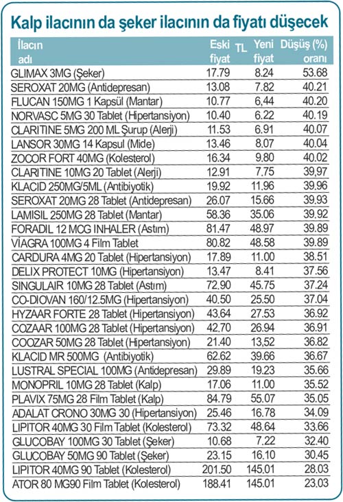 18 Eylül'de yapılan düzenlemeyle orijinal ve jenerik ilaç fiyatlarında yüzde 60 indirim öngörüldü. 700 kalem ilaca uygulanan kamu iskontosu yüzde 11'den yüzde 24'e çıkarıldı. Böylece 3 bine yakın ilaç daha ucuz satılacak. Bu ilaçlar arasında yüksek tansiyon, kanser ve şeker hastalığı ilaçları da bulunuyor.