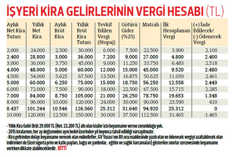 Tabloda detayları yer alıyor. Yıllık net 101.244 TL'ye (Aylık net 8.437 TL) kadar işyeri kira geliri olanlar vergi iadesi alabiliyor. Misal; 2015'de yıllık net 24.000 TL (aylık net 2.000 TL) kira elde eden bir mülk sahibi, beyanname verecek ama vergi ödemeyecek ve 2.100 TL'de vergi iadesi alacak.Vergi iadesi alacaklardan sonra şimdi madde madde işyeri kirasının vergilendirmesindeki detaylara göz atalım...