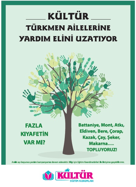 Ankara'da mülteci olarak bulunan ve yardıma ihtiyacı olan Türkmen aileleri tespit eden Kültür Koleji yetkilileri, yardım etmek isteyen öğrenciler için bir afiş hazırlattı.