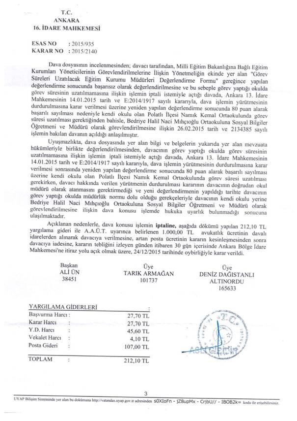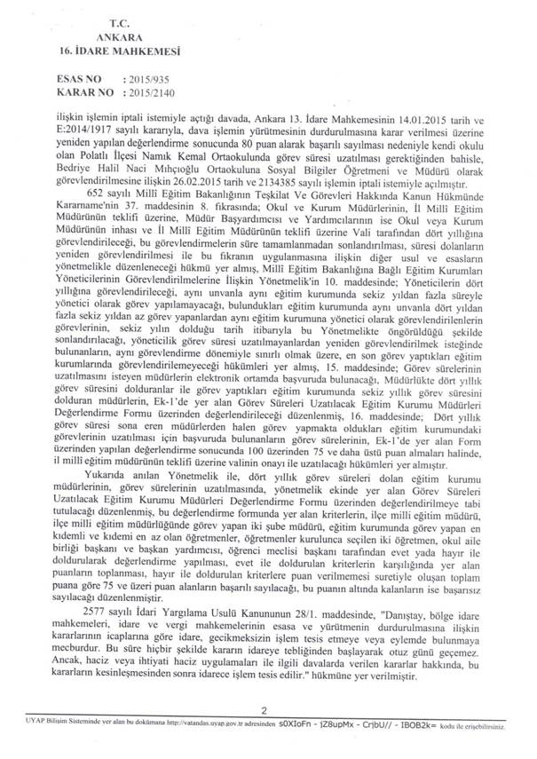 Türk Eğitim Sen Üyesi Hasan DURAN’ın Ankara İli Polatlı İlçesi Namık Kemal Ortaokulunda Müdürlük görev süresinin uzatılmasıyla ilgili yapılan değerlendirme sonucu düşük puan verilmesi işleminin yürütmesinin durdurulması üzerine yeniden yapılan değerlendirmede 80 puan alarak kendi okulunda başarılı sayılmasına karşılık; kendi okulu olan Namık Kemal Ortaokulunda görev süresi uzatılması gerekirken, Bedriye Halil Naci Mıhçıoğlu Ortaokuluna Müdür olarak görevlendirilmesine ilişkin işlemin Ankara 16. İdare Mahkemesinin 2015/935 E., 2015/2140 K. Sayılı ve 24.12.2015 tarihli kararı ile iptaline hükmedilmiştir. Kararın gerekçesinde, yargı kararı gereği yeniden değerlendirmenin yapıldığı tarihte davacının görev yaptığı okulda müdürlük normu dolu olduğu gerekçeleriyle kendi okulu yerine Bedriye Halil Naci Mıhçıoğlu Ortaokuluna Sosyal Bilgiler Öğretmeni ve Müdürü olarak görevlendirilmesine ilişkin işlemde hukuka uyarlık bulunmadığı belirtilmiştir.