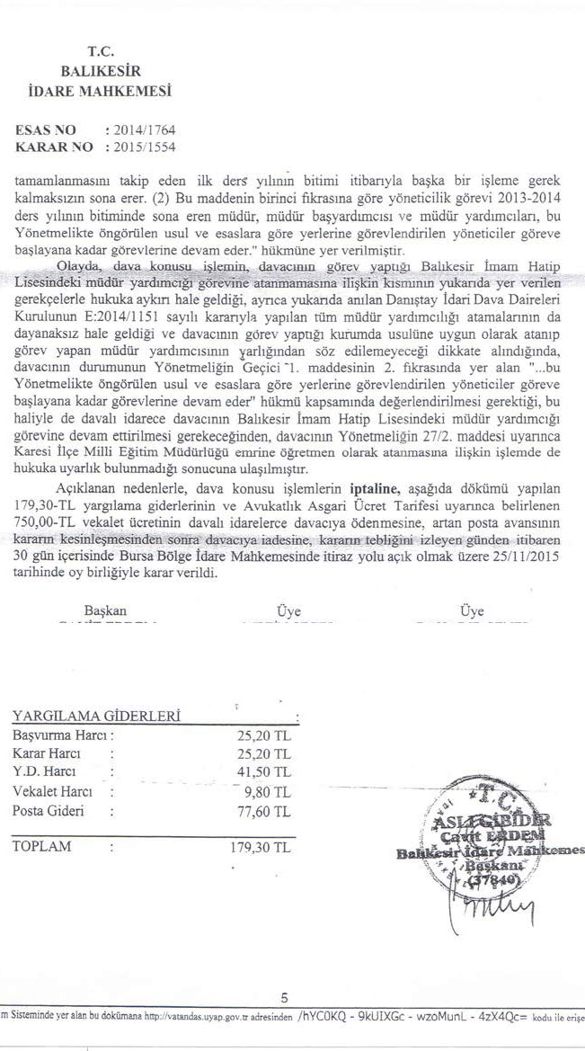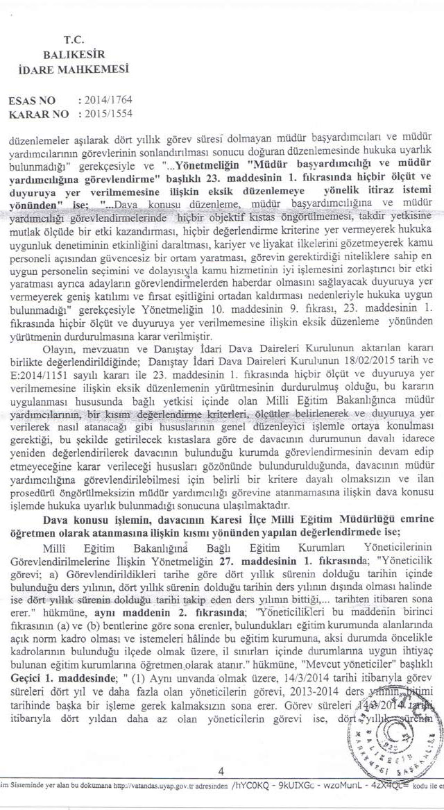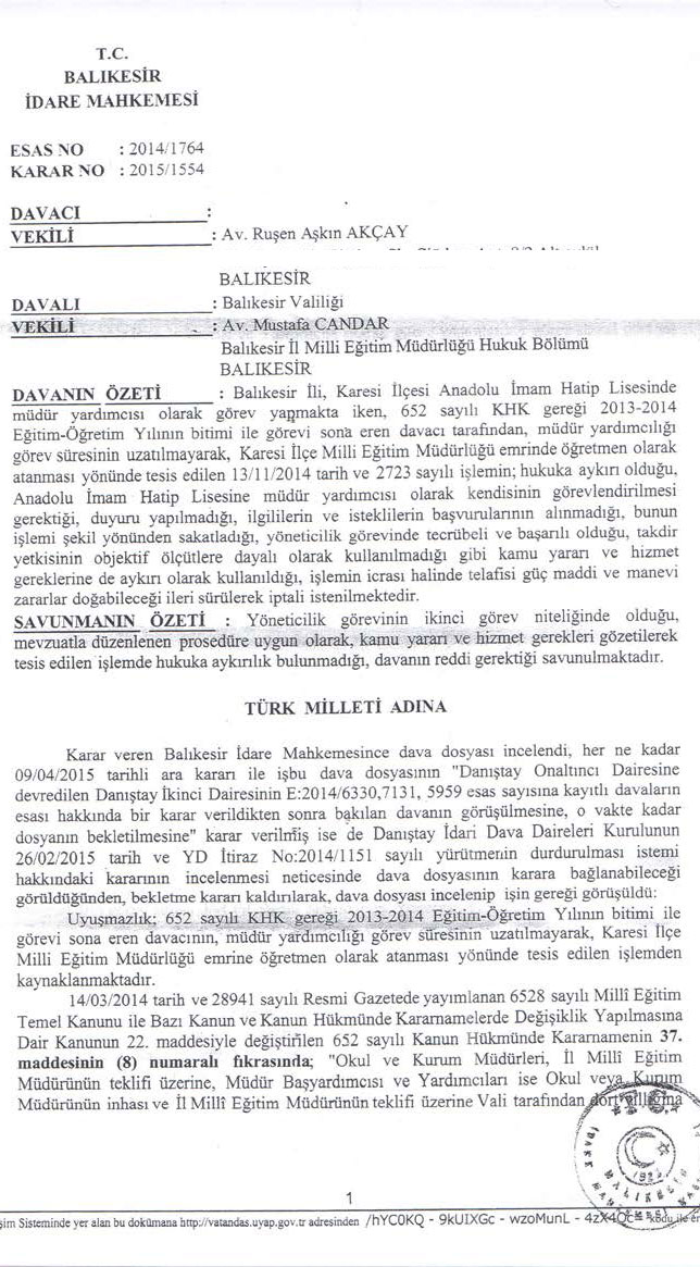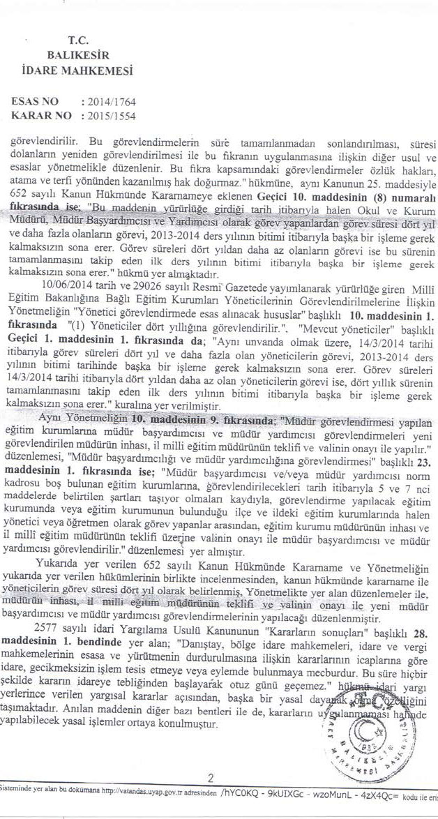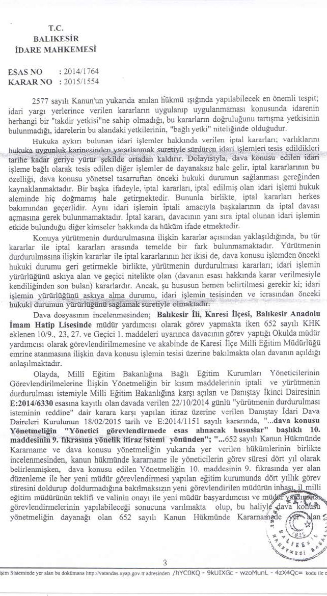 Balıkesir İdare Mahkemesi’nin 2014/1764 E., 2015/1554 K. sayılı ve 25.11.2015 tarihli kararı ile dava konusu işlemin iptaline karar verilmiştir. İlgili kararda; Danıştay idari Dava Daireleri Kurulunun 2014/1151 E. sayılı kararıyla yapılan tüm müdür yardımcılığı atamalarının da dayanaksız hale geldiği ve davacının görev yaptığı kurumda usulüne uygun olarak atanıp görev yapan müdür yardımcısının varlığından söz edilemeyeceği belirtildikten sonra, davacının durumunun Yönetmeliğin Geçici 1. Maddesinin 2. Fıkrasında yer alan “….bu Yönetmelikte öngörülen usul ve esaslara göre yerlerine görevlendirilen yöneticiler göreve başlayana kadar görevlerine devam eder” hükmü kapsamında değerlendirilmesi gerektiği, Yönetmeliğin 27/2. Maddesi uyarınca İlçe Milli Eğitim Müdürlüğü emrine öğretmen olarak atanmasına ilişkin işlemde hukuka uyarlık bulunmadığı belirtilmiştir.