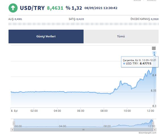 Dolar/TL , sabah saatlerinde küresel risk iştahındaki düşüş ve dolardaki kuvvetlenmeyle 8,35 seviyesinde gezinirken Türkiye cumhuriyet Merkez Bankası Başkanı Şahap Kavcıoğlu'nun çekirdek enflasyon vurgusu sonrasında yüzde 1'den fazla yükselişle gün içerisinde 8,46'nın üzerini gördü.
