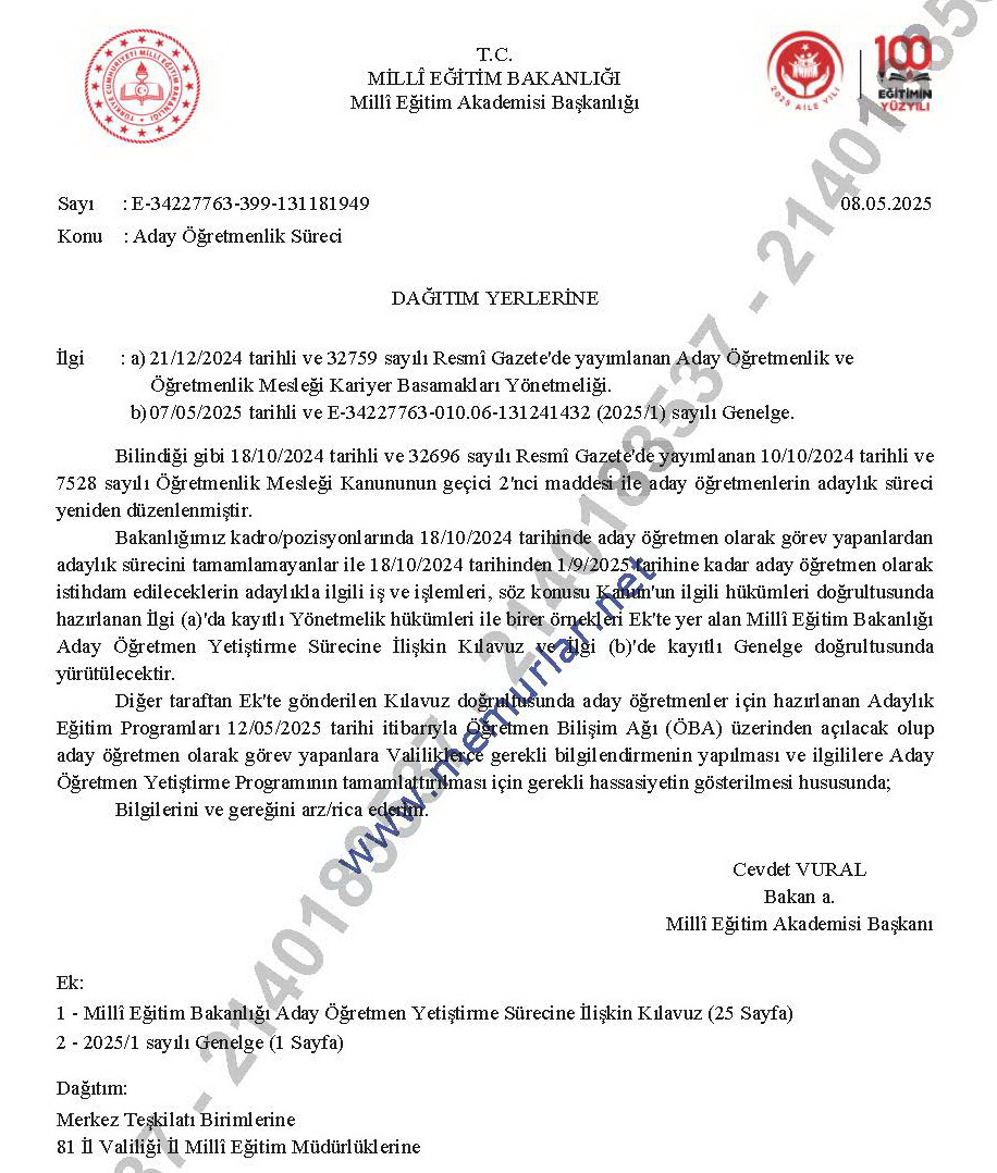 Milli Eğitim Bakanlığı Milli Eğitim Akademisi Başkanlığı 07.05.2025 tarihli, 131241432 sayılı ve 2025/1 Nolu, "Aday Öğretmenlik Süreci" konulu genelge yayımlandı.