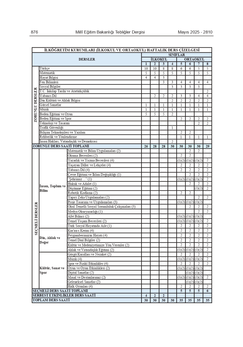 Milli Eğitim Bakanlığı, 2025 yılı için ilkokul ve ortaokullar için haftalık ders çizelgesini değiştirerek yeni eğitim öğretim yılından itibaren düzenlemeyi yürürlüğe koydu