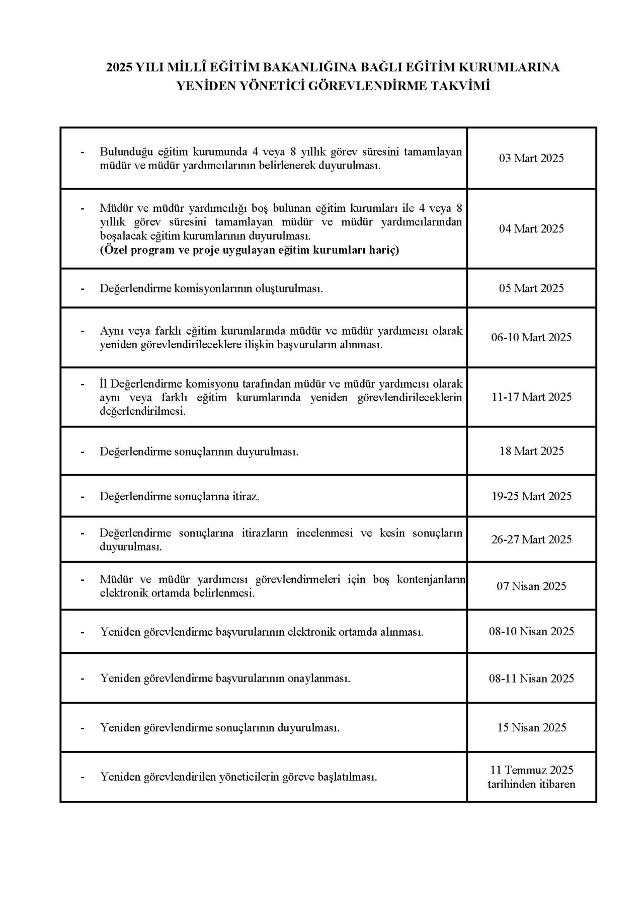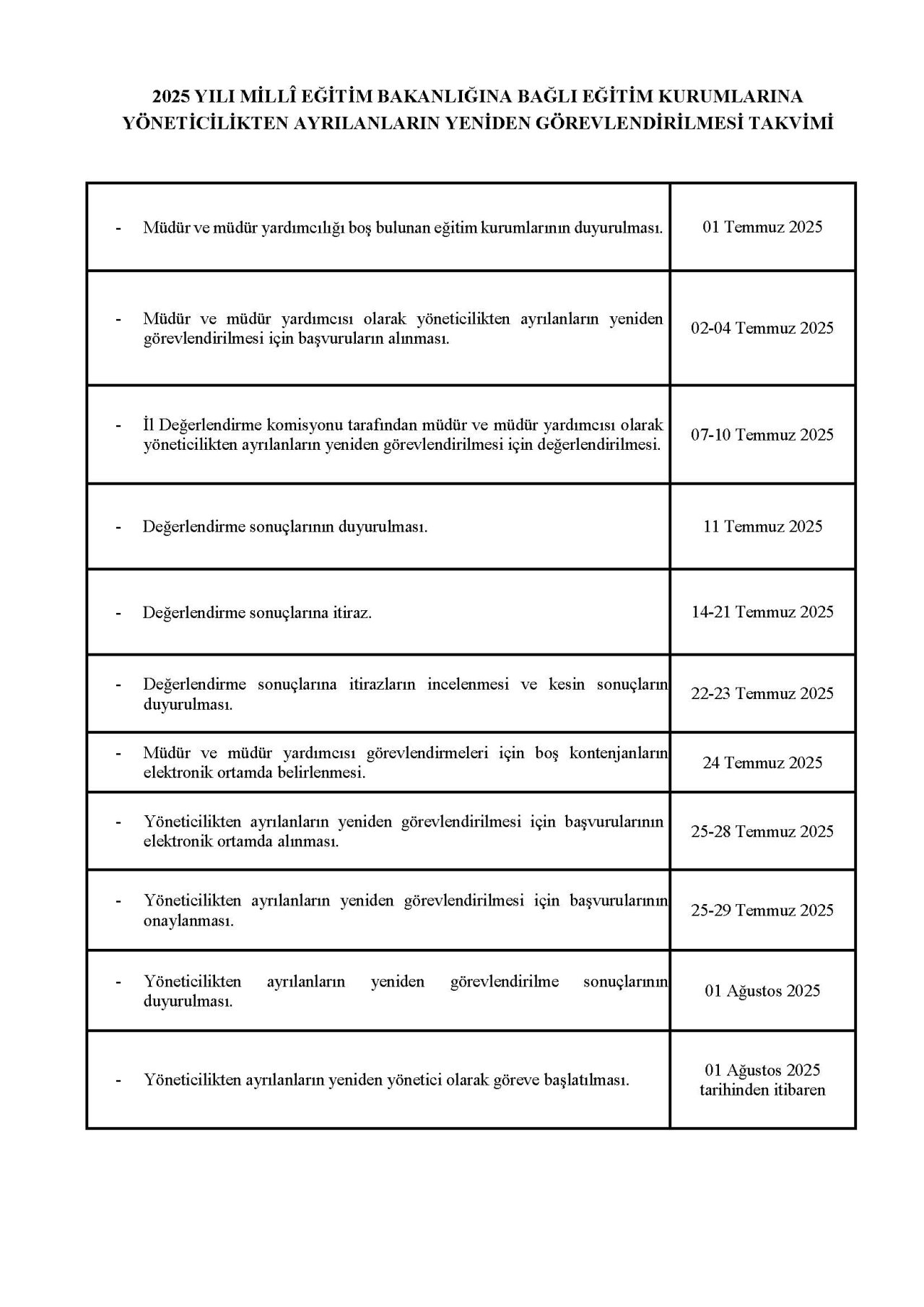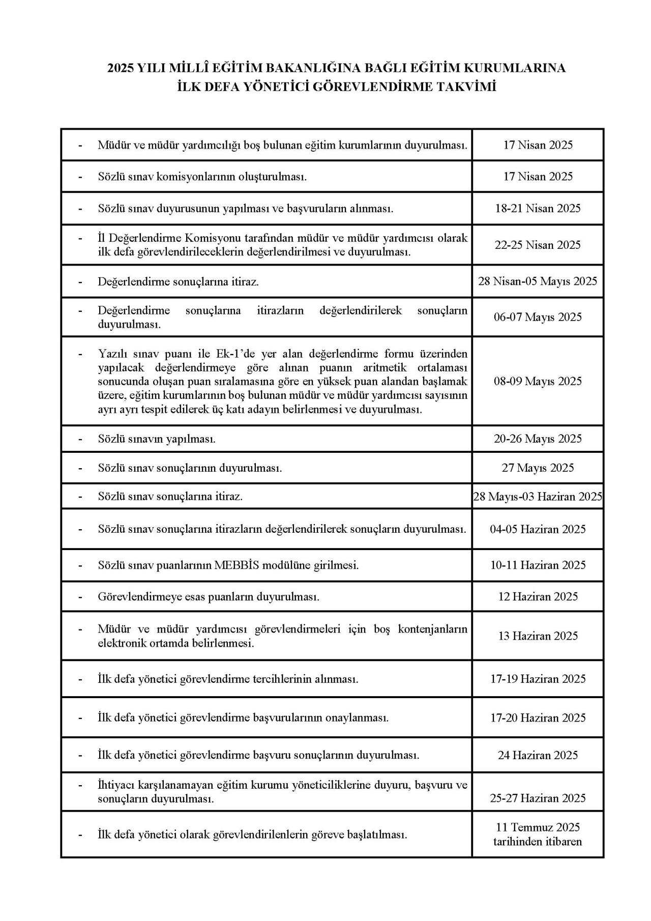 Millî Eğitim Bakanlığına Bağlı Eğitim Kurumlarına Yönetici Seçme ve Görevlendirme Yönetmeliği çerçevesinde hazırlanan 2025 yılı Millî Eğitim Bakanlığına Bağlı Eğitim Kurumlarına Yönetici Görevlendirme Takvimleri