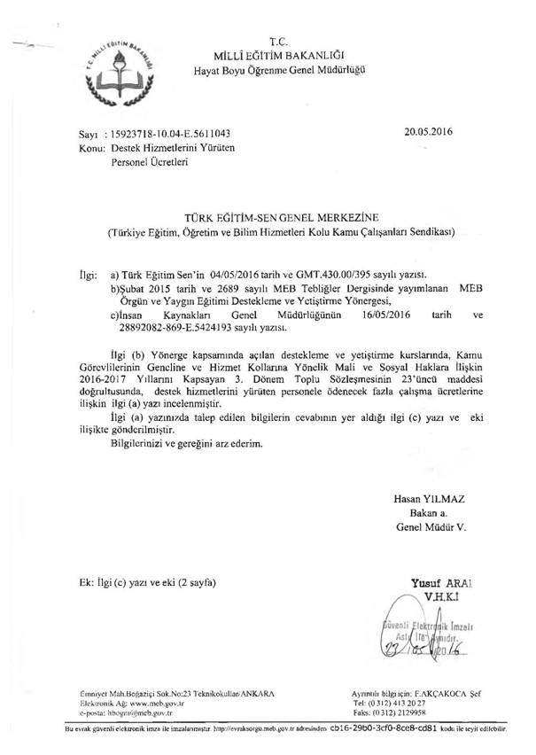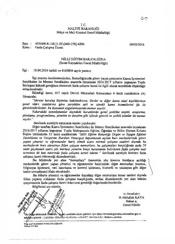 Türk Eğitim-Sen olarak hafta içi çalışma saatleri dışında okul ve kurumlar bünyesinde açılan yetiştirme kurslarında görev alan destek hizmetlerini yürüten personele kurs merkezlerinde görev yapmaları karşılığı 2016-2017 yıllarına yönelik toplu sözleşme metninin 23. Maddesi doğrultusunda ödenmesi gereken fazla çalışma ücretlerinin zamanında ödenmemesi sebebiyle 04/05/2016 tarih 395 Sayılı yazıyla Milli Eğitim Bakanlığı’na yazdığımız yazı Maliye Bakanlığı Bütçe ve Mali Kontrol Genel Müdürlüğü tarafından 09.05.2016 tarihinde 45516914-110.11.05-(460-278)-4206 sayılı yazıyla cevaplandırılmıştır.